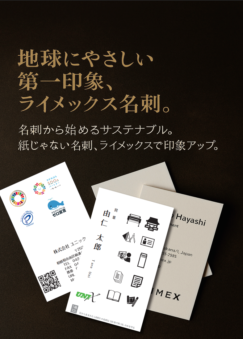 私たちの名刺は、環境に配慮した新素材「LIMEX(ライメックス)」を使用しています。ライメックスは石灰石を主原料とした日本発の革新的な素材で、紙やプラスチックの代替として注目されています。